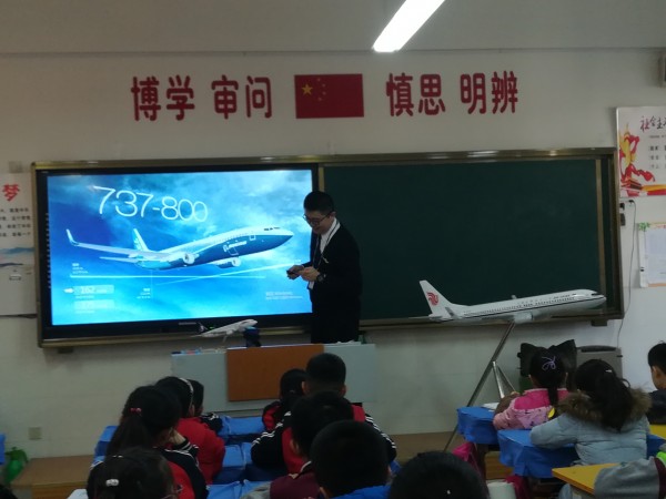 王老师从一段飞机起飞的视频导入课堂,引起了孩子们的极大兴趣。接着王老师结合着给孩子们带来的波音747-800飞机模型,给孩子们讲解了飞机的机身构造。期间穿插了飞机的发明创造史及有趣的航空文化知识。并通过互动提问等环节让学生们充分融入到情景中,增加了科普知识的趣味性。