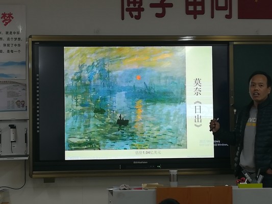 上课伊始,陈老师给大家展示了一系列有世界影响力的美术作品,诸如达-芬奇的《蒙娜丽莎》、莫奈的《日出印象》和梵高的《向日葵》等。陈老师通过通俗易懂、深入浅出的语言与学生说作品、谈感受,孩子们在享受了一场视觉盛宴的同时也对这些美术作品有了基本的评析和个人见解。对孩子们的艺术品位的提高起到了启蒙引领的作用。