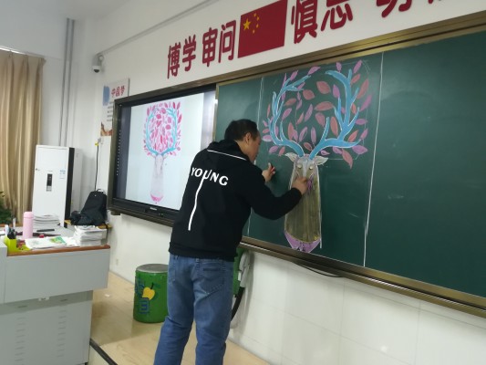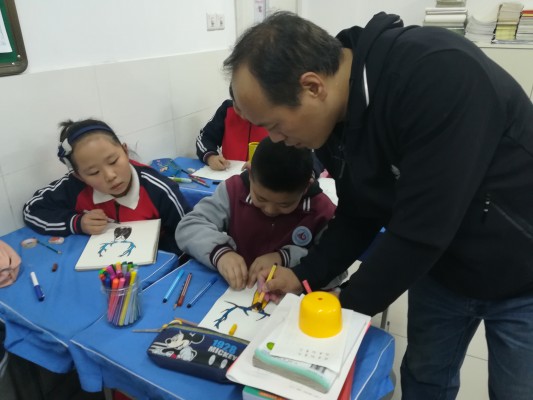 期间,陈老师要求同学们和他一起画了一幅美术作品。老师用粉笔在黑板上讲解的同时作画,孩子们用水彩笔在纸上与陈老师同步。陈老师时不时走到孩子们中间进行指导并耐心示范,孩子们也乐此不疲,按要求完成了此幅作品。