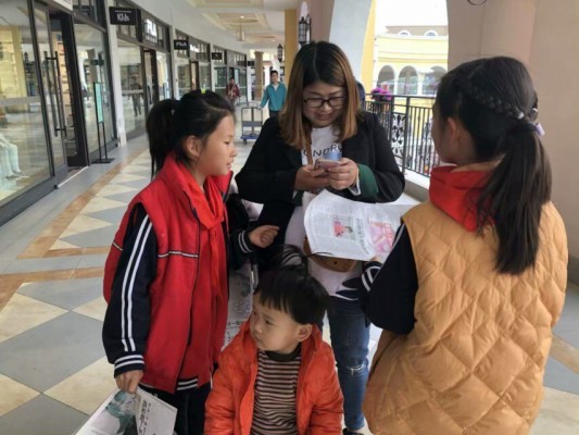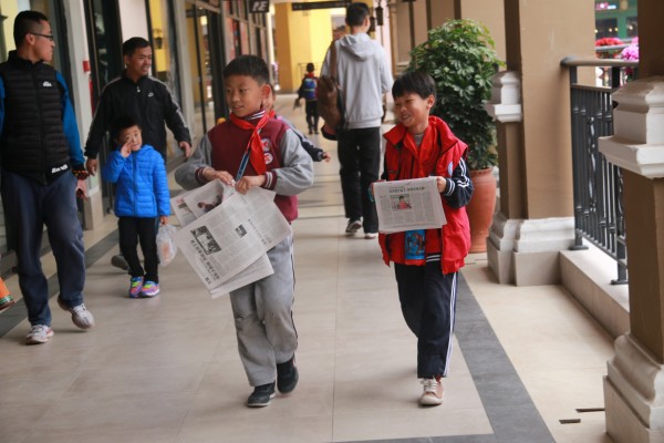 随着活动的进行,不少队员都开张了。一时间,商场各个角落里随处可见他们的身影。队员们热情主动,大胆上前,各出奇招,踊跃地与自己的“客户”沟通。有的队员直接走进店里,为店员们推销。还有的队员结伴而行,互帮互助。当然,也有的队员接连询问了好几位路人,却没有人愿意买自己的报纸,连续的“打击”并没有让他们气馁。依旧充满信心的去向路过的行人推荐报纸。大多数的行人听说义卖活动之后,都愿意献出一份爱心,其中不乏一口气买下好几份报纸的好心人。“小报童们”就这样边走边吆喝,这不光要克服恐惧,和陌生人打交道,还要用尽可能清晰、简洁的语言让别人停下来,知晓自己的卖报意图。在大家的努力和热心市民们的帮助下,活动开展的十分顺利。
