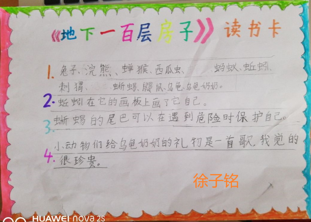 小蜗牛拥有了“世界上最大的房子”,那《地下100层房子》又有什么神奇之处呢?一年级的孩子们在读完绘本故事后还做了读书卡,看看他们的精彩成果吧!