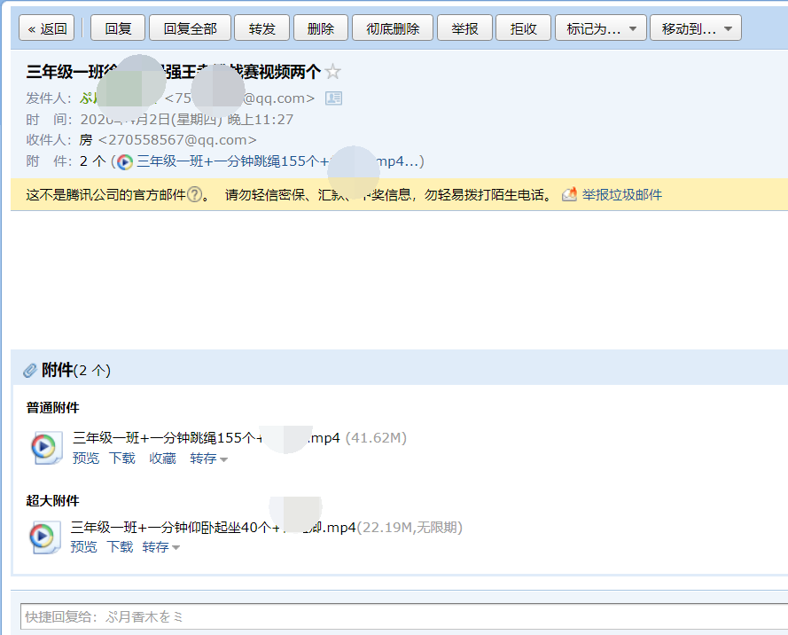 学生以自愿的形式录制完整不间断的视频提交参赛,视频开头自报年级、班级、姓名、参赛项目、挑战宣言。5月23日(周六)晚18点前把视频以:年级+班级+参赛项目+成绩+姓名的形式(视频命名)发送到指定邮箱270558567@qq.com。过期不予参赛受理{时间以邮件显示时间为准}