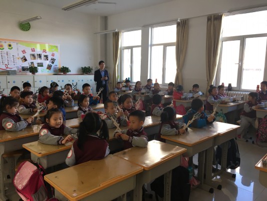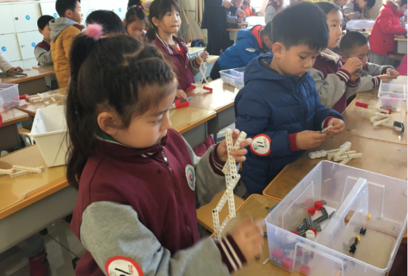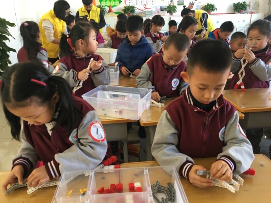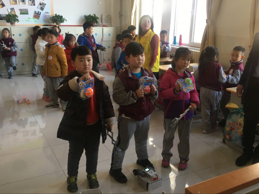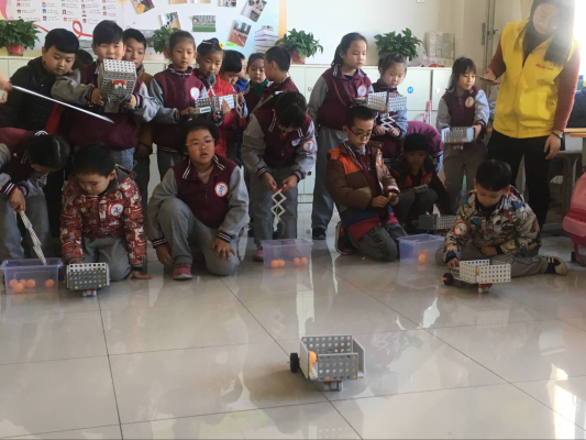 上课前,孩子们分成了13个小组,每组3人。每个学生都有一份操作工具,在课堂上老师给孩子们讲解了机器人的构造,并讲授了创造机器人的方法。讲解完后,老师下令分组合作制作机器人,制作完后进行比拼,选出制作机器人跑的最快的前三个小组,颁发神秘奖品。